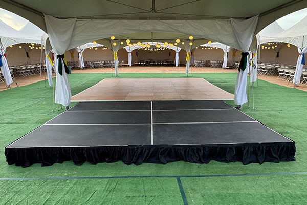 Beautiful backyard stage and dance floor configuration at set up before the event.
